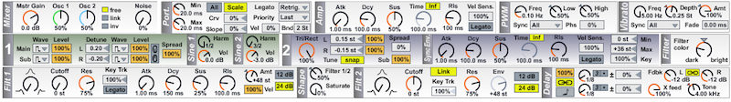 Both filters can switch between 12 and 24 dB and Filter 2’s cutoff may be linked to filter 1 (± halfsteps) or may be set independently. Additionally, a tone control is available for adjusting the cutoff frequency of the onepole filters relative to the main cutoff frequency.